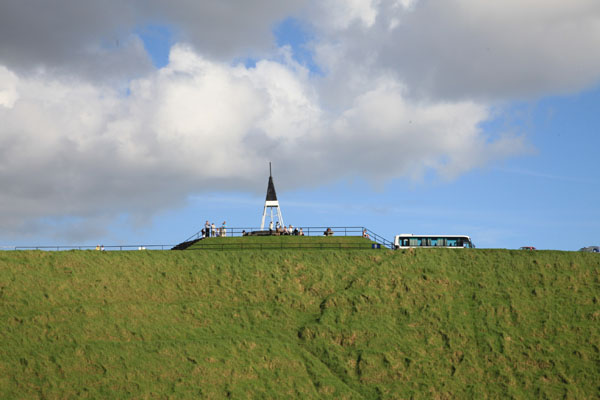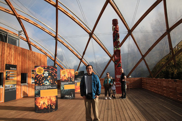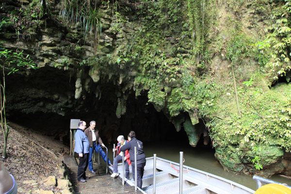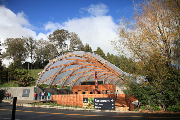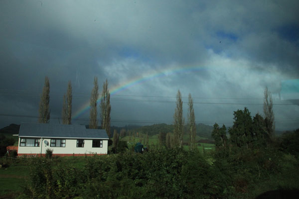 ロトルアよりワイトモを目指す。南島のような平原ではなく、なだらかな起伏がある 天気は晴れたり曇ったり。1日の四季がある NZでは、しばしば虹がかかる光景を見た ワイトモまでは約2時間。 それこそ、天気はまぶしいくらいに晴れたかと思えば、雨も降り出したりで翻弄される。やっぱり、鍾乳洞までは傘を持たなければならないようだ。 ワイトモ鍾乳洞はカルスト地形で、この辺り最大の洞窟。 マオリ族はこの洞窟に入らなかったがヨーロッパ人たちが入植してから、マオリ族に頼んで測量し探検したそうだ。そのとき土ボタルが発見された。 ワイトモ鍾乳洞ゲート。とても整備されている 土ボタルと言っても蛍ではなく、蚊のような虫の幼虫だ。 半年くらい幼虫でその間光を放つ。十年くらい前にオーストラリアで見に行ったが、延々と車で走り長い坂道を徒歩で下った割には、洞窟には行って何処に土ボタルがいるんや!というくらいで、ガックリきたことを思い出す。 あんなものなら、延々と2時間もバスを走らせてくる必要もないと思っていた。 鍾乳洞へ入る前 ワイトモ鍾乳洞に10:00am到着。 晴れているが、ガイドが言うので一応傘を持って行くが、全く必要ない。一旦雨が降るとボタボタと滴が酷いらしいのである。 鍾乳洞は秋芳洞などと比べるとその足下にも及ばない規模だが、光の演出で貴重な自然に仕立てあげ、世界中から観光客を集めていた。 珊瑚の屑が堆積して隆起したようなイメージで、日本のカルスト地形の方が花崗岩など固くしっかりとした地形のような気がする。 洞窟に入ると、徐々に下っていき、大聖堂という大空間に着く。そこに土ボタルがいる、というので、どこに居るだろうかと思い目をこらして天井などを見回す。 「すごい!」などと言う人がいるので、どこかにはいるはずだが、ちっとも発見できない。 多少光っているかな、と思うくらいで、自分の目は他の人よりも悪いのではないかと疑心暗鬼になってきた。 その後、さらに奥の暗い狭いところに行ったのだが、そこへ来てやっと1つの土ボタルを発見できたのだ。 さらに、下を覗き込んだところに10個くらい発見したが、それらははっきりとそこにいるのがわかる。大聖堂では、やっぱりそんなにたくさん居なかったのだ。 そこから少し下ってボートに乗り込む。 すると、凄い!!天井一面が天の川のよう。たくさん土ボタルが光を出している。ボートは手でワイヤーを引っ張りながら移動していた。 女性のガイドだったが、マオリの血を引いているのだそうだ。 ずっと天の川が続いているような、凄い量の土ボタルでオーストラリアのとは全く違い規模も遙かに大きく、きれい。北島観光の最大のみどころらしい。 土ボタルを見るためにボートが通る鍾乳洞の幅は3〜4mくらい。天井の高さは2〜5mくらいか。 そこを音も立てずおしゃべりもせず、シーンとした中、どこかで水が滴る音だけが響く中を、約20人ほどが乗ったボートが進む。 鍾乳洞の出口ボート降車場 真っ暗な世界の中に一面星のように土ボタルが輝く別世界が20分くらい続く。ずうっと目を凝らしながらやや黄色い点々を見つめてその広がりに感動。 やがて、船は出口にたどり着き、そこで岸にボートから降りて階段を上がり、入場したゲートへ帰ってきた。これは素晴らしかった。 その後、昼食のレストランへ。ベジ(野菜)・スーパーを併設している。 畑の中になるリンゴをもぎ取って食べて良い、と言ってくれので、りんご園の中へみんなで降りていき、どの実がおいしそうか物色して、一つ頂いて食べてみた。 日本のリンゴより小振りで皮は剥ぎにくいが、甘くて美味しかった。 食事はビーフステーキ・ラムステーキ・白身のフライの中からチョイスする。この中でならビーフがいいのではないかと、迷わず決定。 NZでは、ビーフ肉が一番お安く、その次がチキン、最上級なのがポークだそうだ。折角だから、NZビーフをしっかりいただこう! その他うどんやカレーライスもあった。 ここのご主人は日本語がペラペラのNZ人でサービス満点。 9歳の娘を連れてきて我々に紹介する。あどけないがお人形さんみたいな顔つきで、みんな見とれてしまっていた。 このレストラン、300席くらいあるが、いつもなら満員で大賑わいなのに、クライストチャーチ地震の影響を受け観光客がバッタリ来なくなったそうで、我々を含めて15人くらい。 泣くに泣けない状態であった。 今NZは何の問題もないので、とにかくこれまでのように観光にやってきて欲しいそうだ。また、クライストチャーチ地震や東日本大震災で復興を望んでいる人たちに対してできることは、観光に行ったり産物などの物を購入してあげることが重要なのだ。 そこらをもっと国を挙げてアピールして欲しいものだ。 ワイトモからオークランドへ向かう国道 昼食後は最終目的地オークランドを目指してひたすらバスで北上する。 太陽は北に傾き、今頃になって昼間の太陽が北にあることを実感。 ワ
