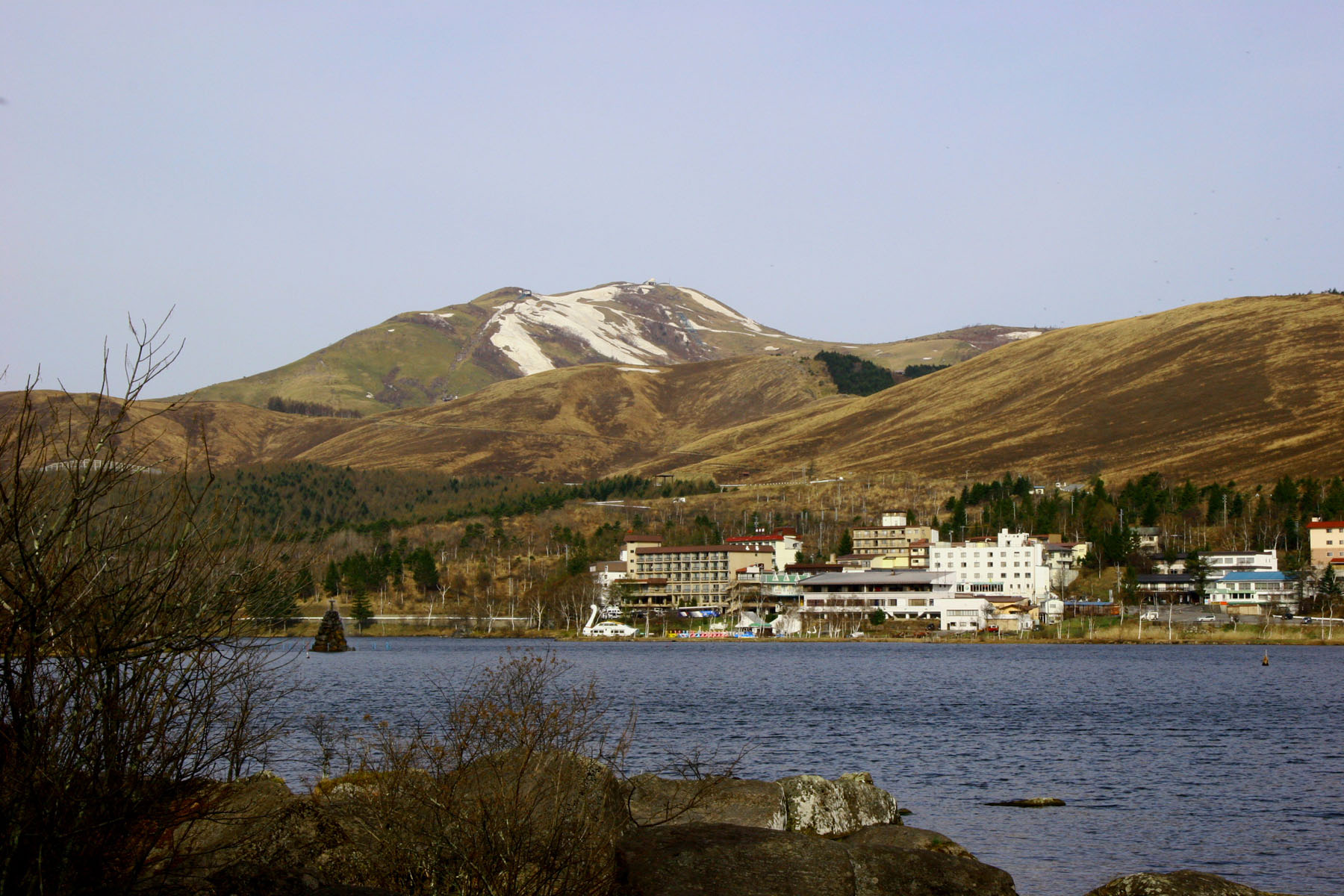 白樺湖畔から見た車山。まだ、残雪が見える。リフトが動くのが遅いため、この日の朝はのんびりだ。朝の空気が気持ちいい。 |