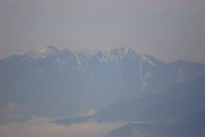 山並みがとてもきれいだった。南アルプスもよく見えた。右から、鳳凰三山、甲斐駒ヶ岳、仙丈ヶ岳。 |